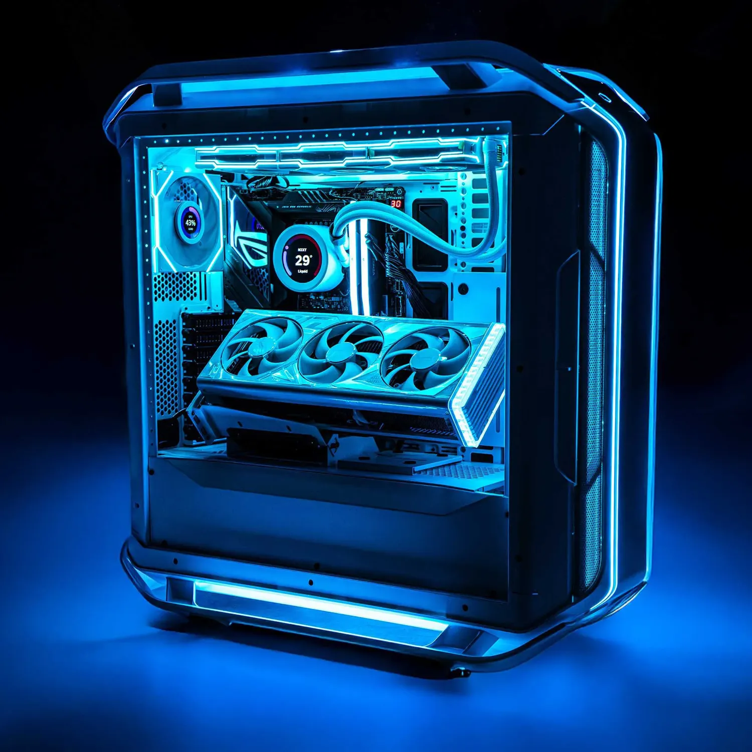 Para sustentar esse poder, o sistema é alimentado por uma fonte de energia de alta potência e resfriado por um complexo sistema líquido de alto desempenho, garantindo estabilidade total mesmo sob overclock extremo e sessões de uso intenso prolongadas. Este computador é a materialização do conceito “sem limites”, criado para quem exige apenas o absoluto melhor.